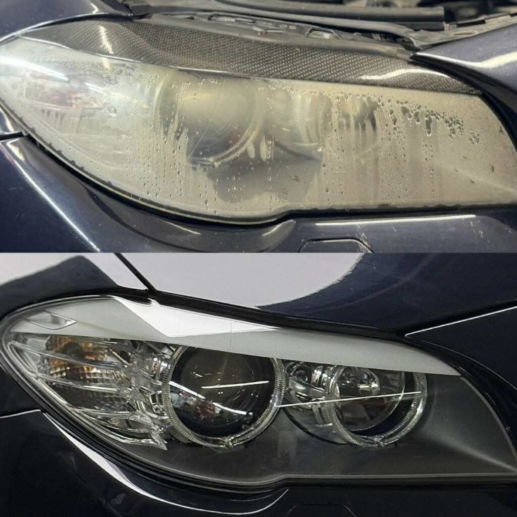 Removal of moisture and condensation from inside the headlight, followed by professional resealing to prevent future water ingress and restore full clarity and performance.